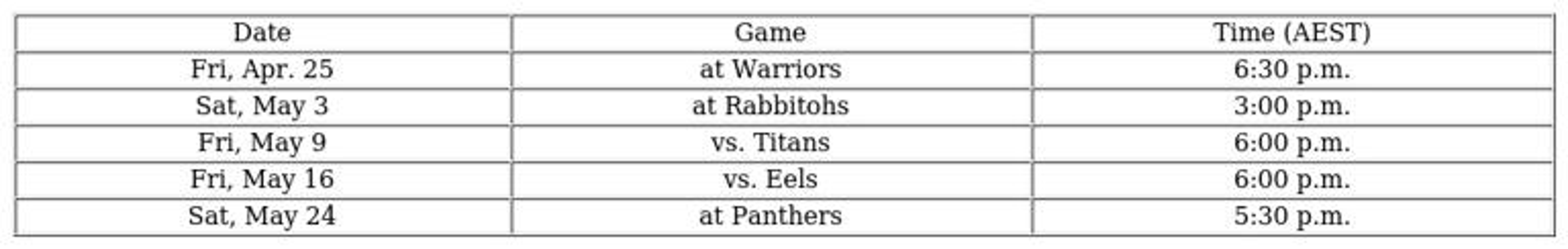 The stretch concludes with an Anzac Day special against the Roosters