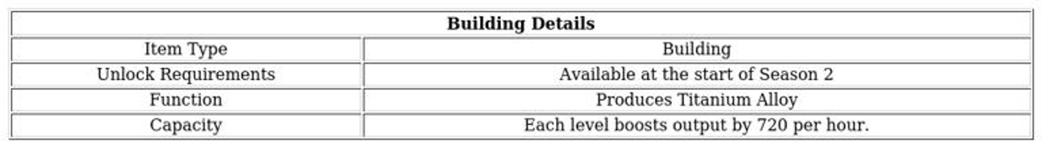 The titanium alloy factory is crucial for generating alloy needed to upgrade the high-heat furnace, which is essential in withstanding cold temperatures, enhancing VR, and unlocking pivotal season structures.