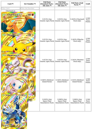 Pull rates for gold cards vary across different sets. For instance, the gold Mew ex from the Mythical Island set has a substantially higher appearance rate compared to gold cards from larger sets like Genetic Apex. This variation is likely due to the size and composition of each set, with smaller sets offering better odds of pulling these prized cards.