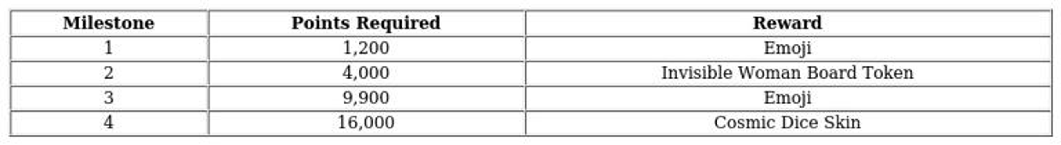 Achieving this cosmic addition requires advancing to specific milestones. Refer to the table below for a detailed overview of the points needed to unlock this limited-edition, Fantastic Four-themed item and enhance your collection with a touch of the cosmos.