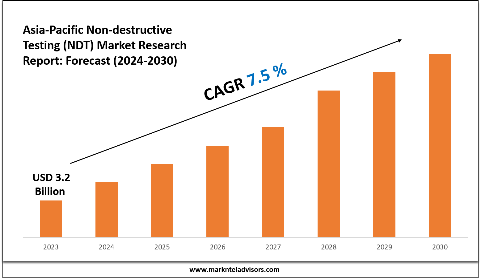 MarkNtel Advisors has released its latest report highlighting strong growth in The Asia-Pacific Non-destructive Testing (NDT) Market size was valued at USD 3.2 billion in 2023 & is estimated to grow at a CAGR of around 7.5% during the forecast period, i.e., 2024-30.