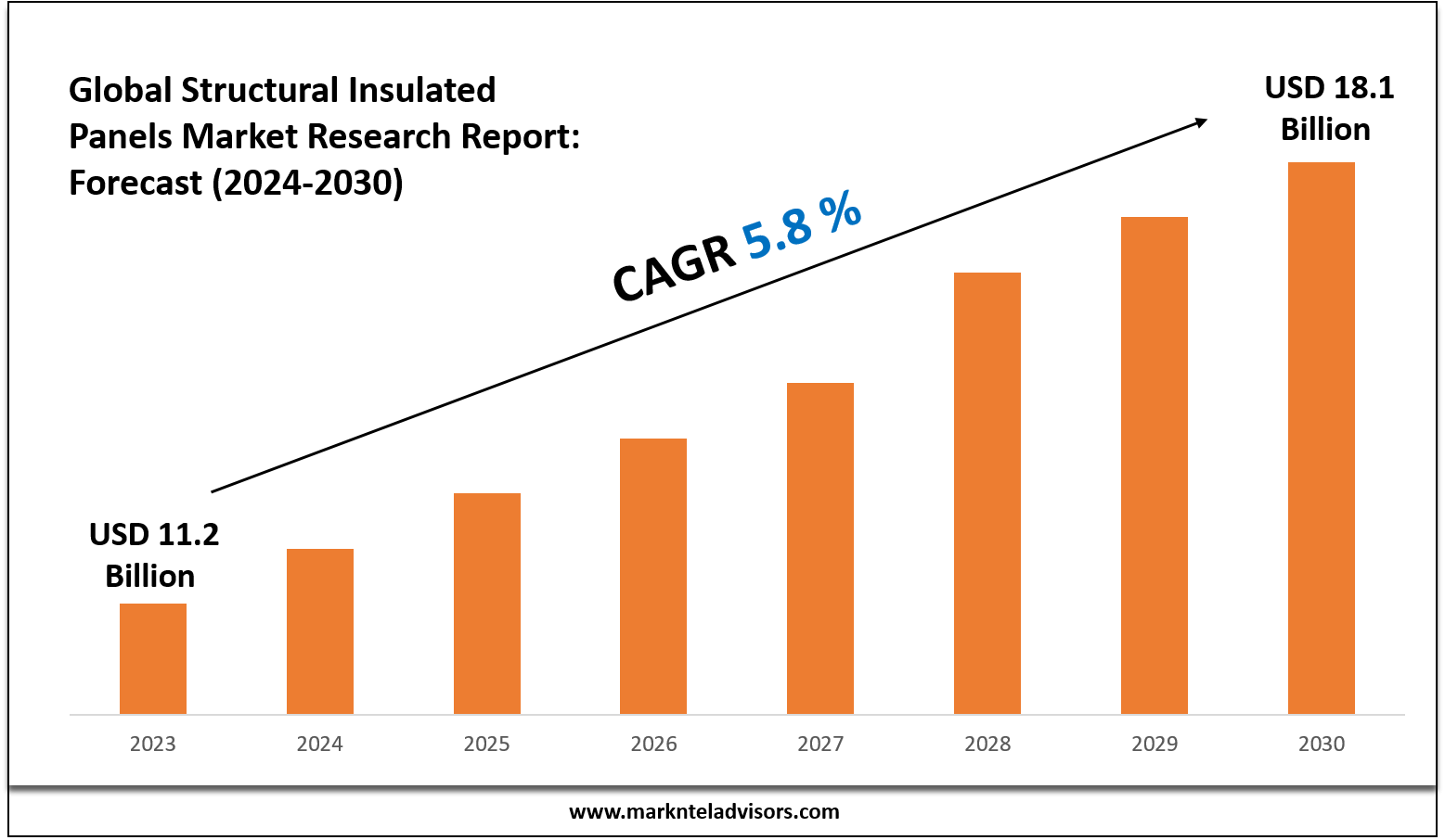 MarkNtel Advisors has released its latest report highlighting strong growth in The Global Structural Insulated Panels Market size is valued at USD 11.2 billion in 2023 & is estimated to reach around USD 18.1 Billion in 2030. The market is also expected to grow at a CAGR of around 5.8% during the forecast period, i.e., 2024-30.
