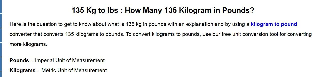 In this era of technology, online tools are available to convert any unit, which can easily convert any quantity in just a few seconds for free, like 135 kg to lbs.