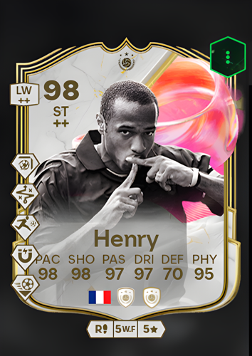 Thierry Henry's Icon card stands out as a formidable Striker, boasting an exceptional overall rating of 98. With lightning-fast pace and clinical shooting both rated at 98, alongside impressive passing and dribbling attributes at 97, this card embodies the qualities of a world-class forward. Henry’s physicality, rated at 95, ensures he can hold his own against robust defenders, while his defensive contribution of 70 adds an extra layer of versatility. As a striker, this card offers a distinct advantage on the pitch, providing sharp attacking prowess that can swiftly break down opposing defenses and capitalize on scoring opportunities, making it a game-changer in crucial moments.
