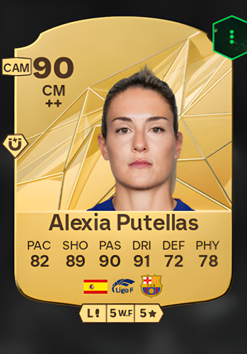 Alexia Putellas Segura's Rare card is a standout choice for any team seeking a versatile and commanding presence in the midfield. With an impressive overall rating of 90, this card highlights her exceptional capabilities as a Center Midfielder. Her pace rating of 82 ensures she can swiftly navigate the field, while a shooting rating of 89 makes her a formidable threat when advancing towards the goal. The passing rating of 90 underscores her ability to orchestrate plays with precision, complemented by a dribbling rating of 91 that allows her to maneuver past opponents effortlessly. While her defense rating of 72 and physicality rating of 78 may suggest a more attacking prowess, they provide a balanced foundation that supports both offensive and defensive duties. This card encapsulates Putellas' sharp attacking instincts and her knack for dismantling defenses, making her an invaluable asset in seizing opportunities and securing victories.