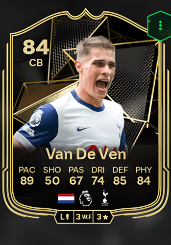 Micky van de Ven's Team of the Week (TOTW) card stands out as a formidable addition to any squad, particularly for those seeking a robust defensive presence. As a Center Back, this card boasts an impressive overall rating of 84, underpinned by a remarkable pace rating of 89, which is exceptional for a player in this position. This speed allows him to quickly close down attackers and recover from potentially dangerous situations. His defensive rating of 85 and physicality rating of 84 further enhance his ability to dominate and control the back line, making him a reliable choice to thwart the opposition's advances. While his shooting and passing ratings of 50 and 67, respectively, suggest a focus on core defensive duties, his dribbling rating of 74 provides an added layer of versatility, enabling him to maneuver effectively under pressure. In essence, Micky van de Ven's TOTW card is a defensive powerhouse that can anchor your team’s defense and provide the stability needed to keep the opposition at bay.