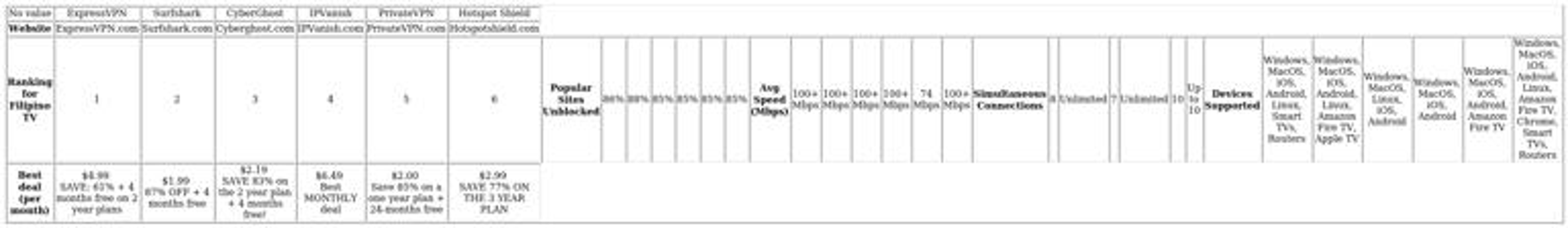 We've analyzed the key features of the leading VPNs available. If you prefer detailed reviews, begin with ExpressVPN, which we have rated as the top choice for accessing Filipino TV.
