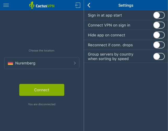 The CactusVPN mobile interface features a minimalist design with a menu accessible via the three-line icon in the top-left corner. Mobile users will notice fewer options compared to the desktop version, lacking protocol selection, kill switch functionality, and DNS leak protection features.
