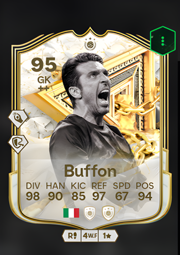 Gianluigi Buffon's Icon card is a standout in the realm of FIFA Ultimate Team, epitomizing excellence with an impressive overall rating of 95. As a goalkeeper, Buffon boasts an array of exceptional attributes that make him a formidable last line of defense. His card is celebrated for its remarkable reflexes, commanding presence in the box, and unparalleled shot-stopping ability, making it an invaluable asset for any team. With Buffon between the posts, players can expect to thwart even the most potent of attacking threats, ensuring a robust and resilient defense that can withstand relentless pressure and secure victories in the most challenging matches.