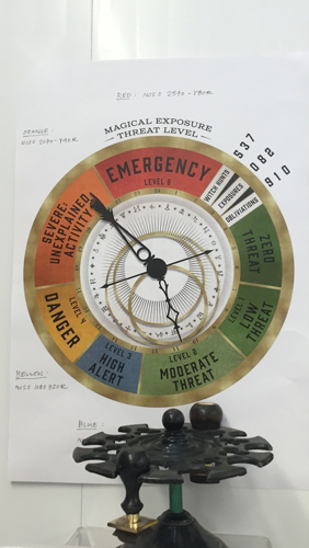 Director of Magical Security Percival Graves kept a miniature version on his desk—a testament to the device's critical importance to MACUSA's security operations. Designed through collaboration between production designer Stuart Craig and graphic artists Miraphora Mina and Eduardo Lima, the detector's aesthetic draws inspiration from both vintage railway station clocks and modern security alert systems.